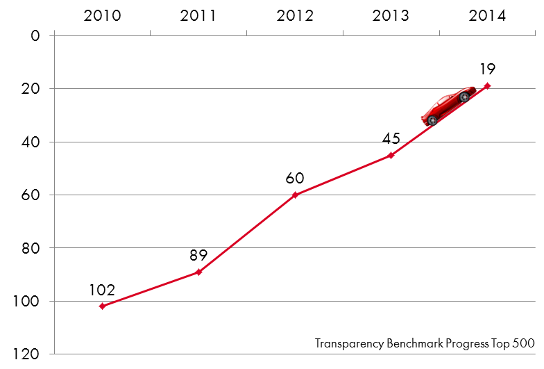 - We are still improving our ranking on the Transparency Benchmark, in 2013 we rose from 45th to 19th place.